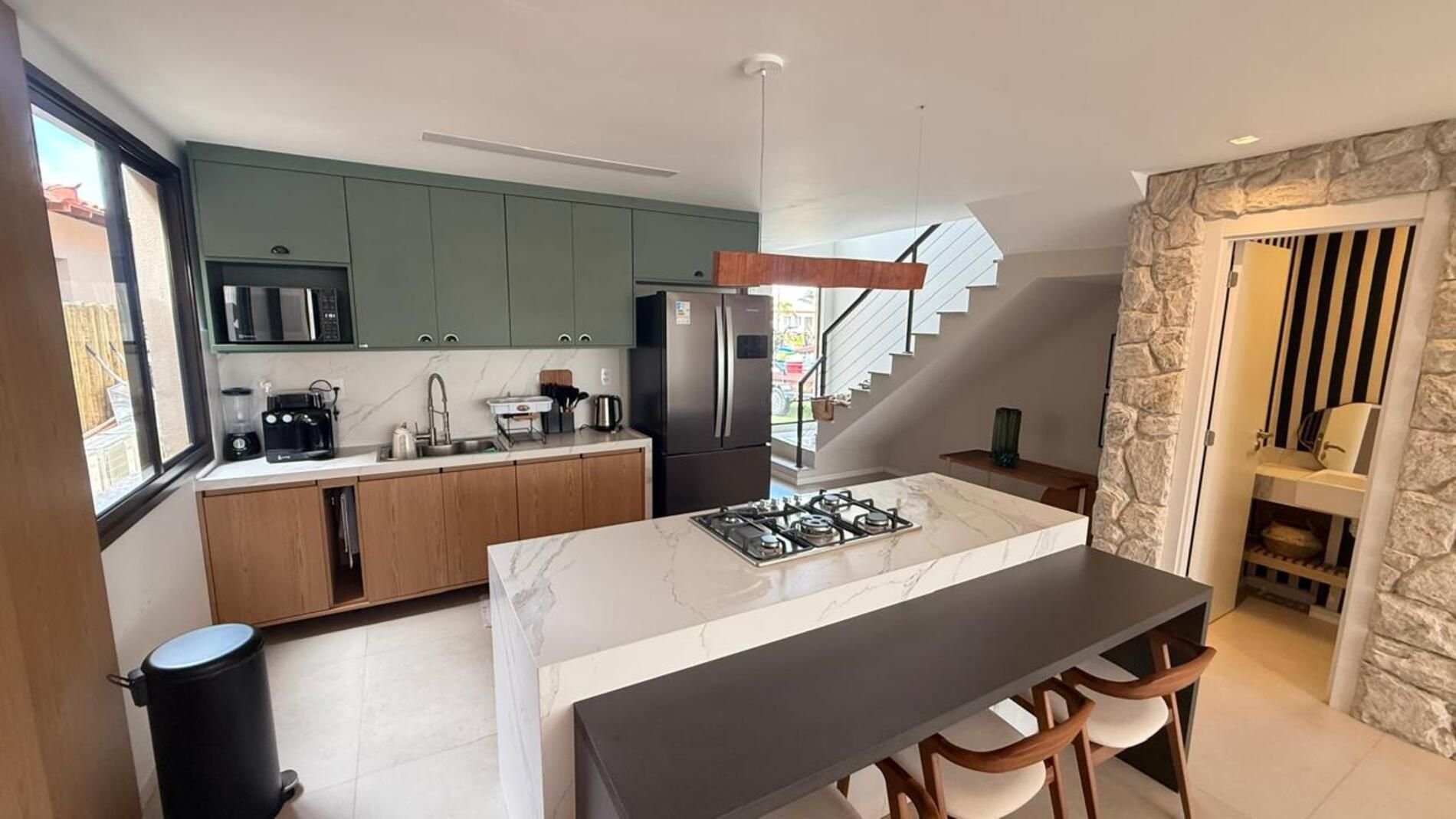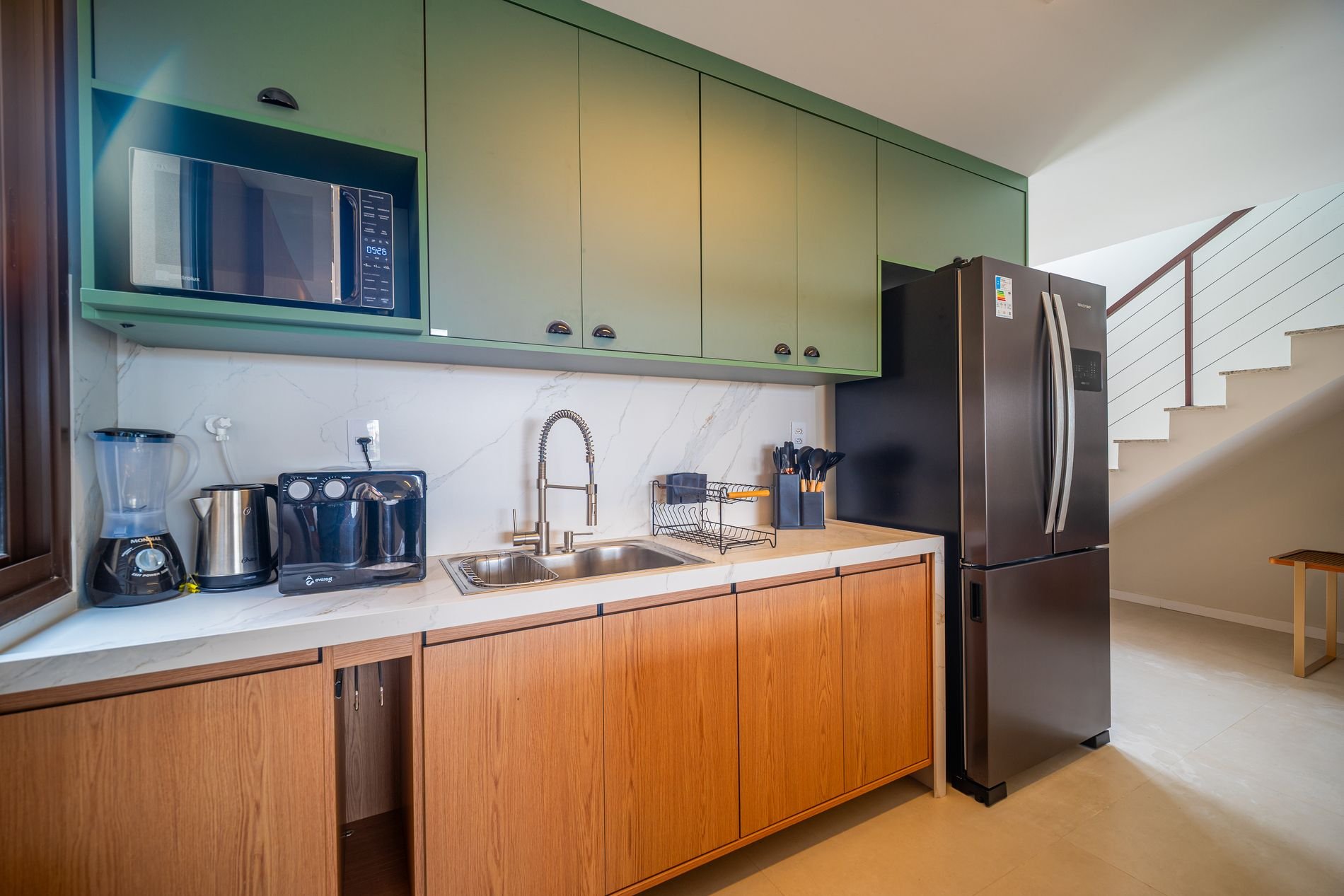 The living room is spacious, integrated with the dining room and kitchen, which is fully equipped with modern appliances, a water filter, and all the necessary items for those who enjoy cooking or simply want practicality in their daily lives. The high-speed Wi-Fi connection is ideal for those who want to relax watching a movie as well as those who need to work during their stay;