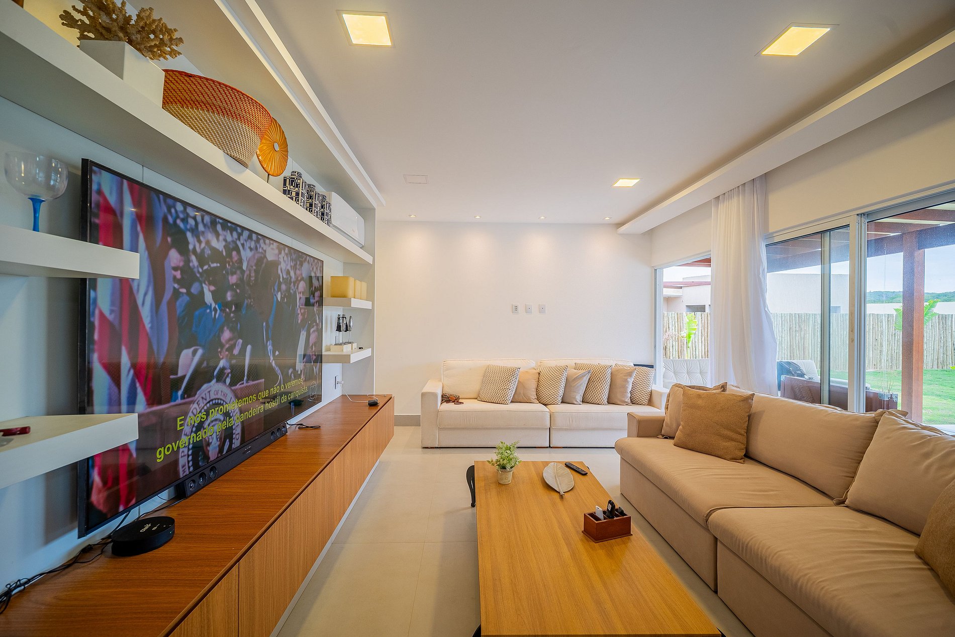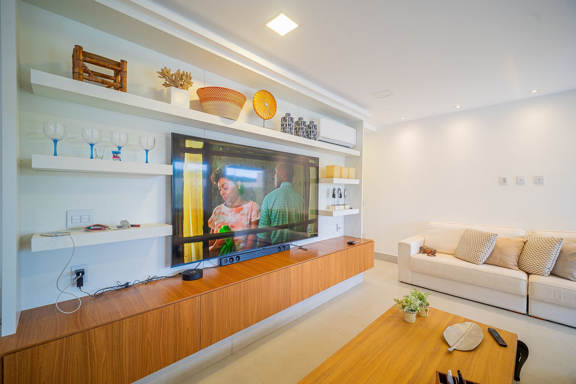 Sala de estar con aire acondicionado, sofá y Smart TV de 86 pulgadas, y comedor con mesa para 6 personas;