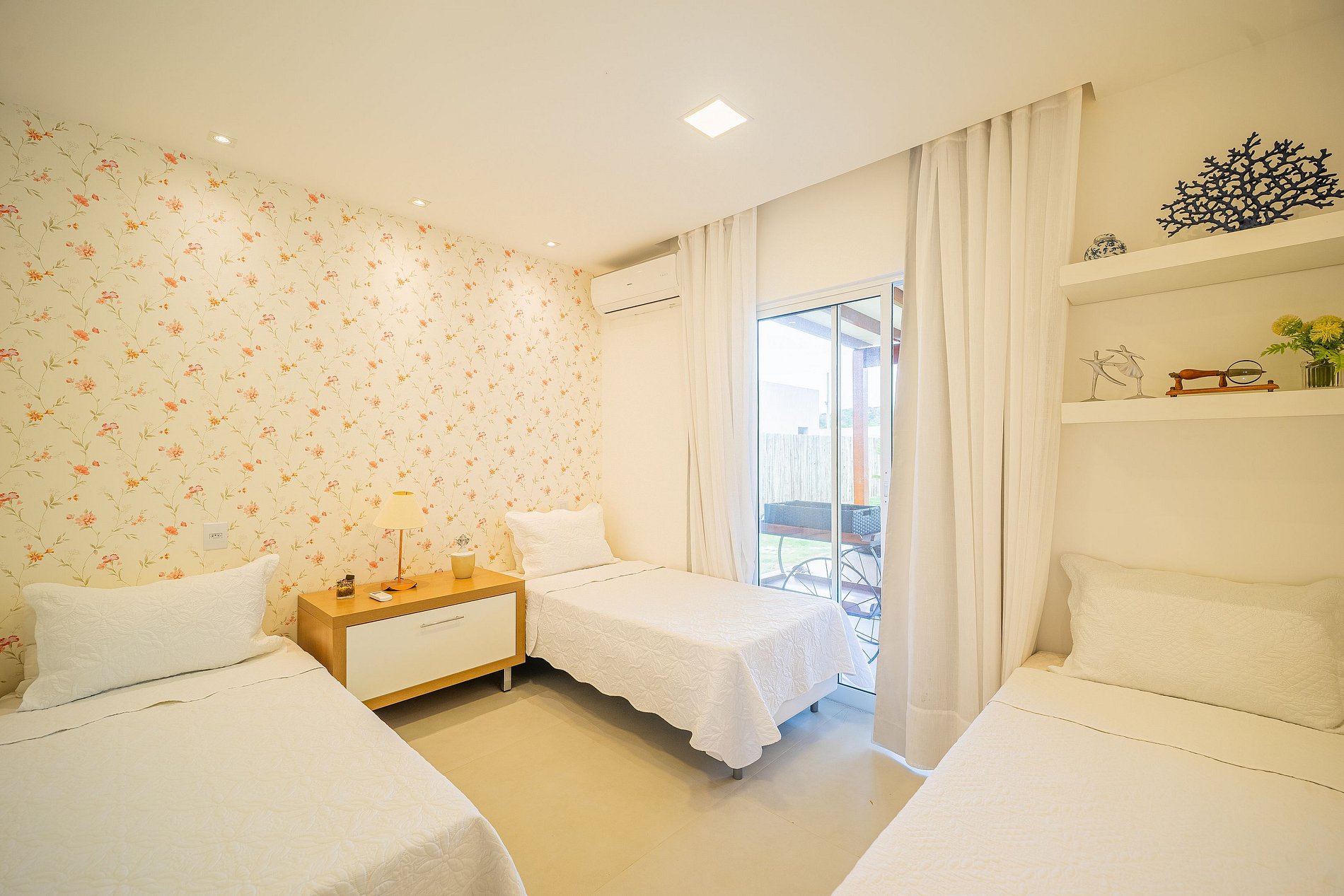 La casa cuenta con cuatro suites con aire acondicionado (dos en la planta alta y dos en la planta baja) con capacidad para 12 personas:
