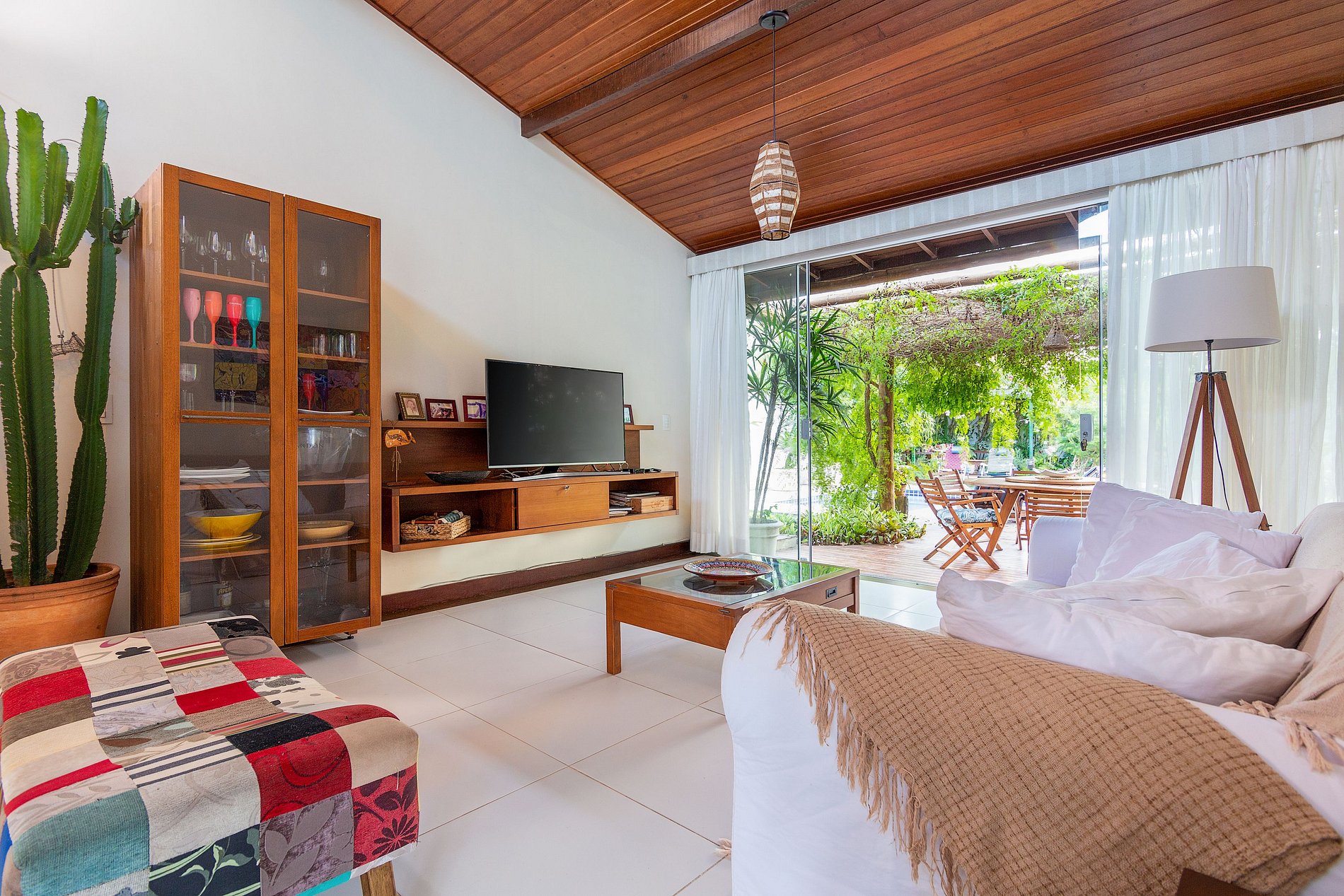 Sala de estar con Smart TV con canales básicos y comedor integrado con mesa para 6 personas.