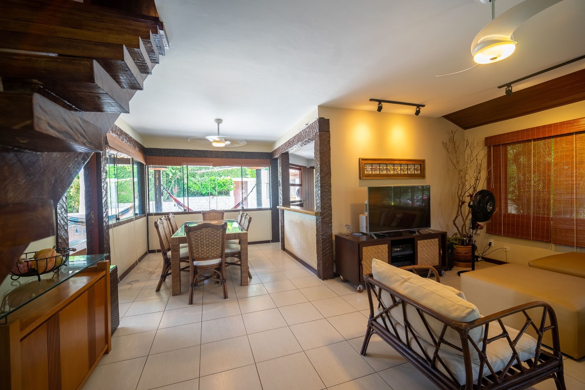 Sala de estar con sofá, TV inteligente y ventilador de techo y comedor con mesa para 8 personas;