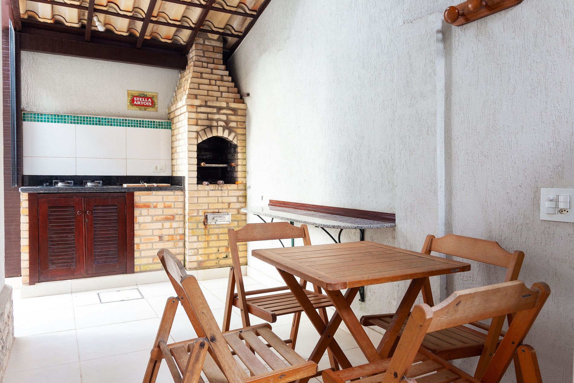 Área gourmet con barbacoa privada, refrigerador y anafe;