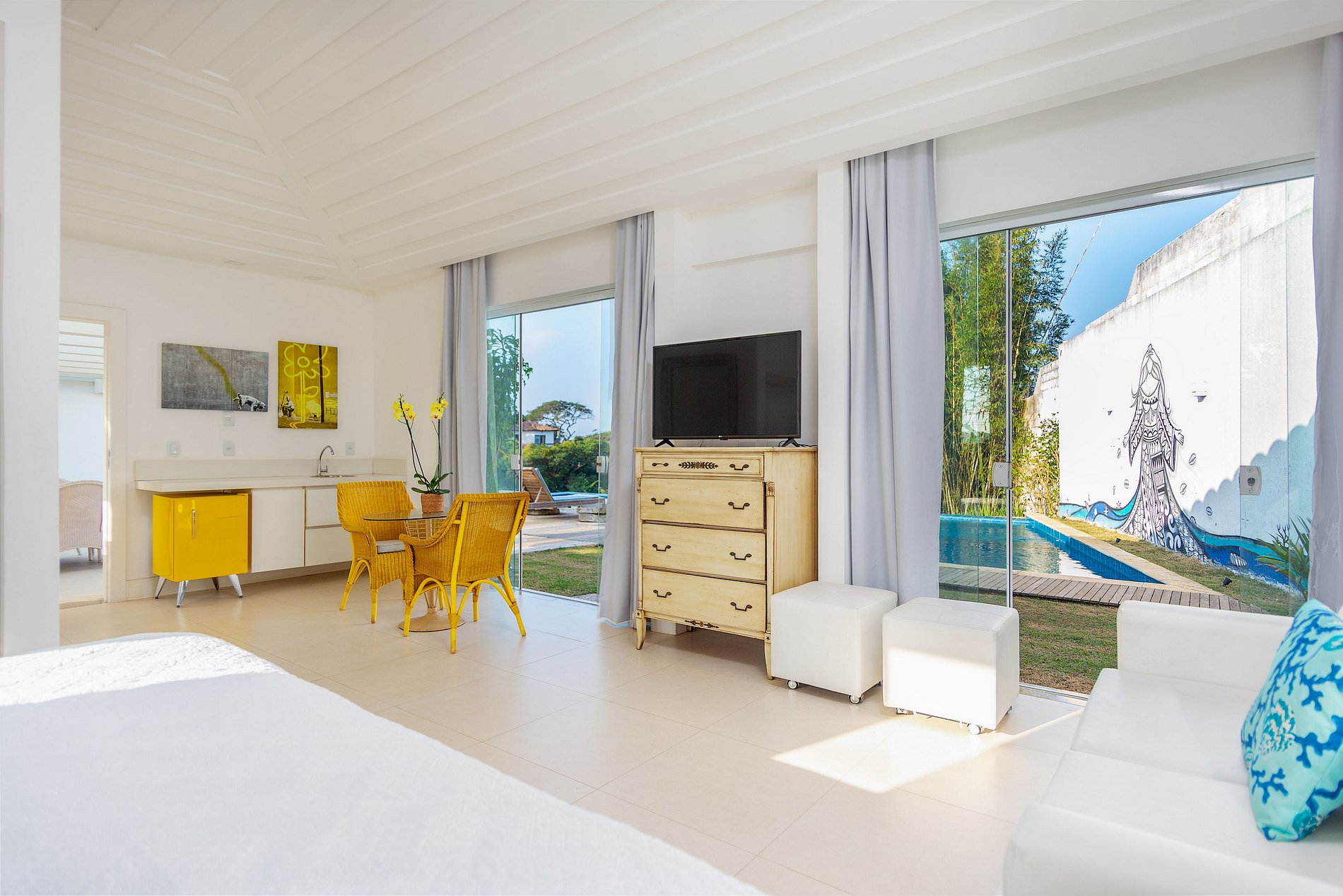 Suite 5 – Planta Baja Externa – Cuenta con aire acondicionado, 1 cama king, armario y baño completo, con vista al mar.