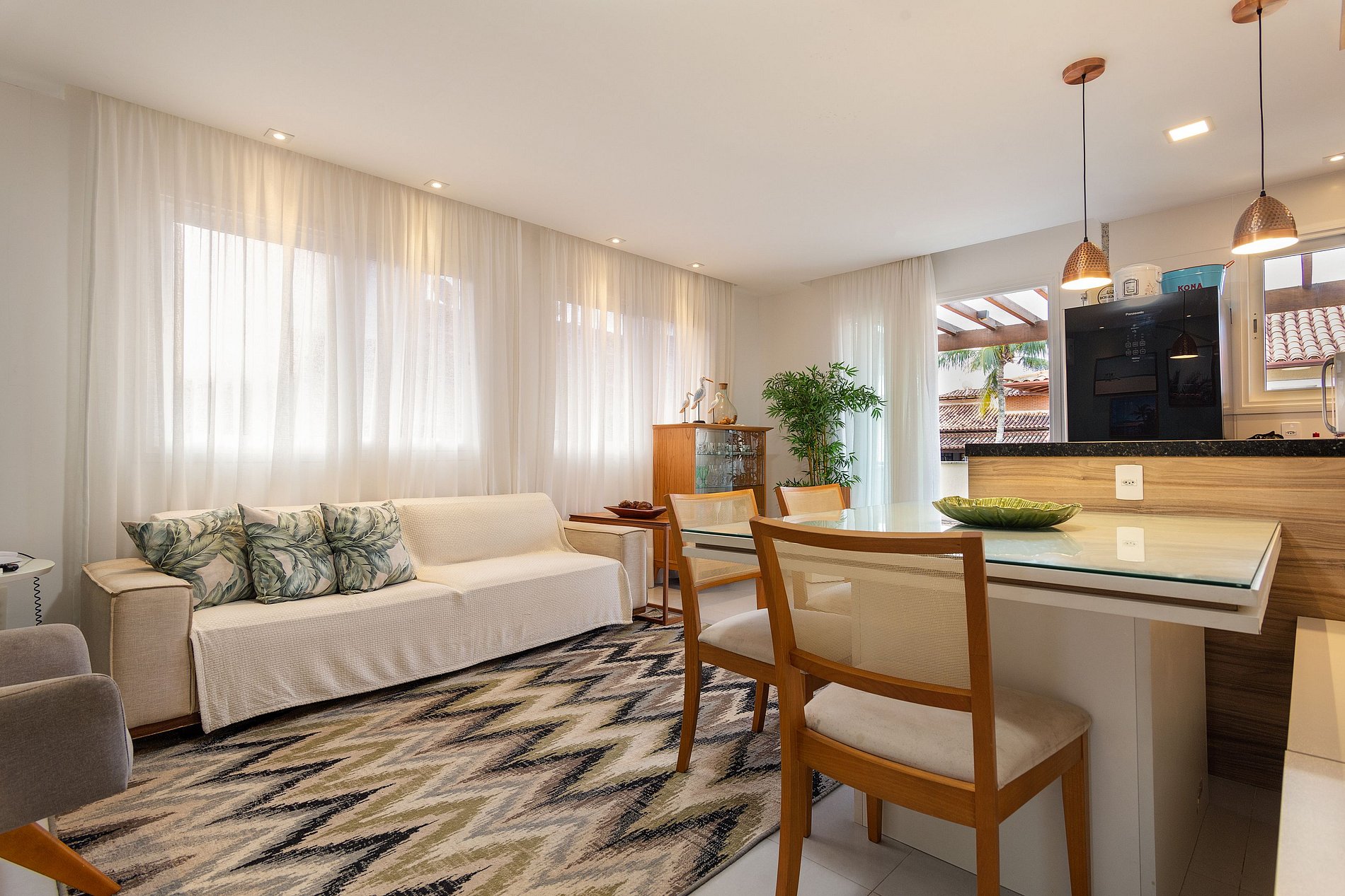 Sofá para 4 personas, Smart TV con canales por cable completos (plan Family), mesa de comedor para 6 personas.