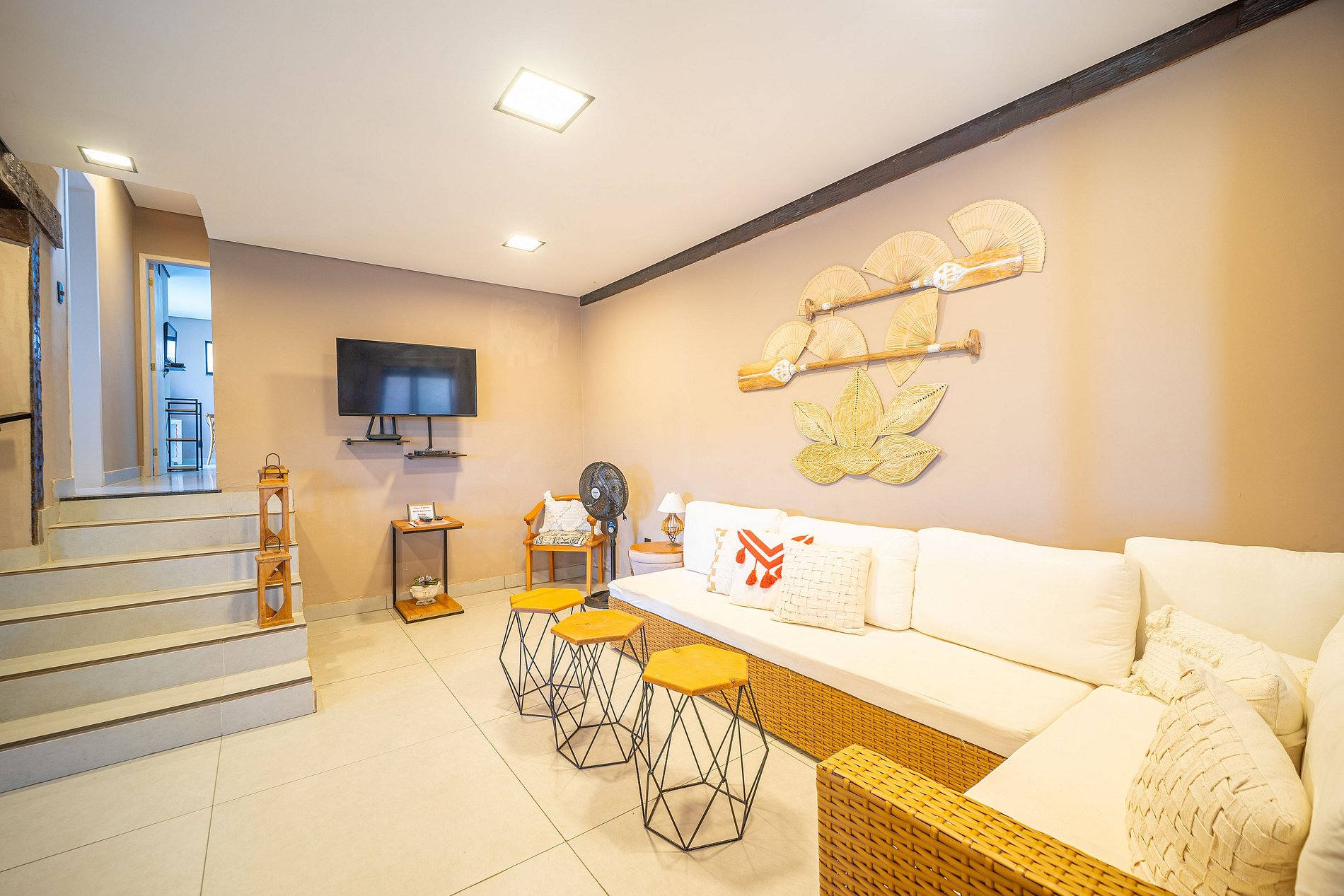 A casa é ótima e muito confortável. Pertinho das praias de geribá e ferradurinha. São 5 suítes, uma com cama king e as outras 4 com bicamas que podem ser utilizadas juntas ou separadas, acomodando 4 pessoas por quarto. Além disso, há uma sala de tv com banheiro, onde tem um futon de casal e um de solteiro, podendo acomodar mais 3 pessoas caso haja necessidade. Todos os quartos tem ar condicionado e ventilador de teto. A casa é super bem equipada e a equipe estava sempre disponível para resolver as questões que surgiram durante a hospedagem. A funcionária Luciana que indicaram é maravilhosa. Dois pontos que cabem ressaltar aos futuros hóspedes: o primeiro é que a casa tem bastante escada, como a maioria naquela região. Segundo ponto é atentar para as condições no momento da reserva: água, luz e valor extra por hóspede a partir de 12 pessoas (na ocasião da minha reserva, a casa estava sendo divulgada como para até 18 hospedes).