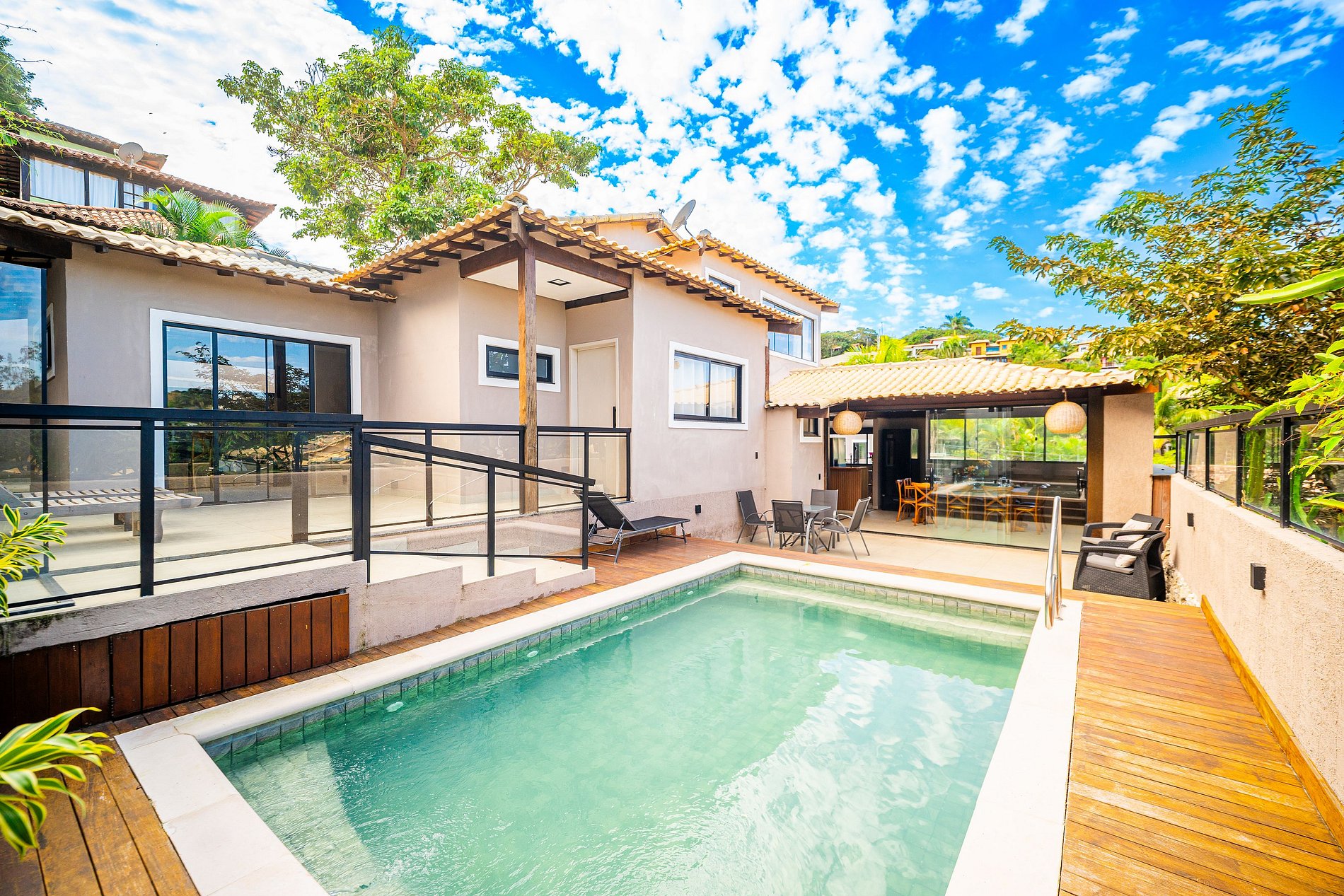 Con piscina privada, ducha, tumbonas y zona de ocio con barbacoa, es la opción ideal para quienes buscan un alojamiento completo, cerca de la playa, con instalaciones para relajarse y disfrutar de todo lo que Búzios ofrece, ya sea en familia o con amigos.