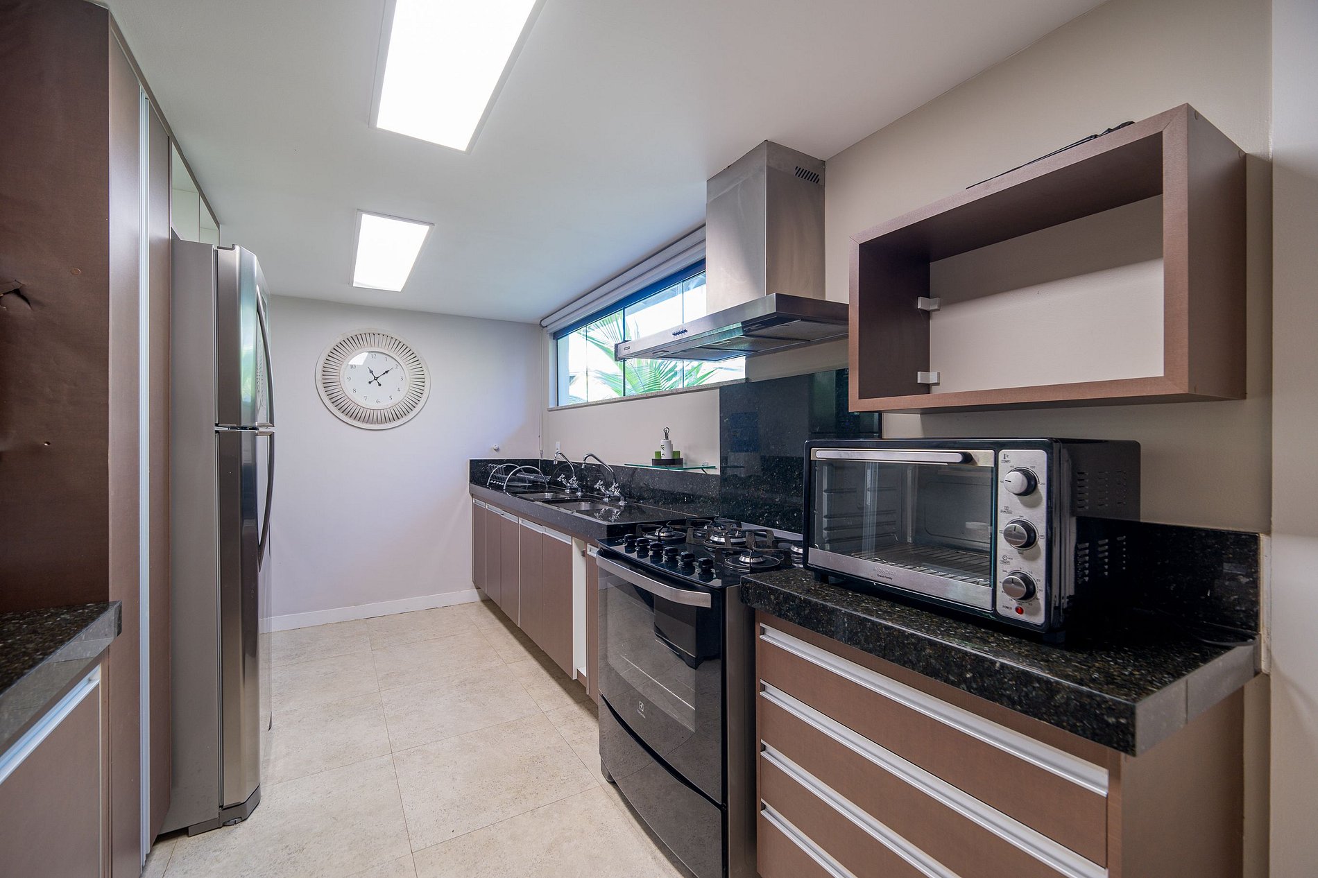 Louças, talheres, panelas, fogão com coifa inox, forno elétrico, geladeira, cafeteira, forno micro-ondas.