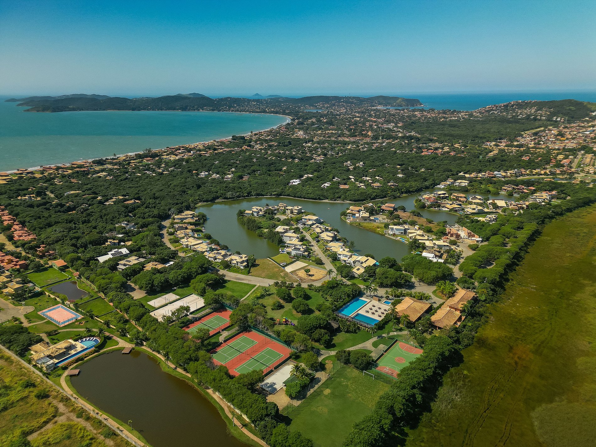 O condomínio tem entrada pela Av Jose Ribeiro Dantas, onde para deslocamento, independente da finalidade, fica muito viável. Tem Ônibus, Vans, Uber. Do condomínio até a praia de Manguinhos dá 200m.