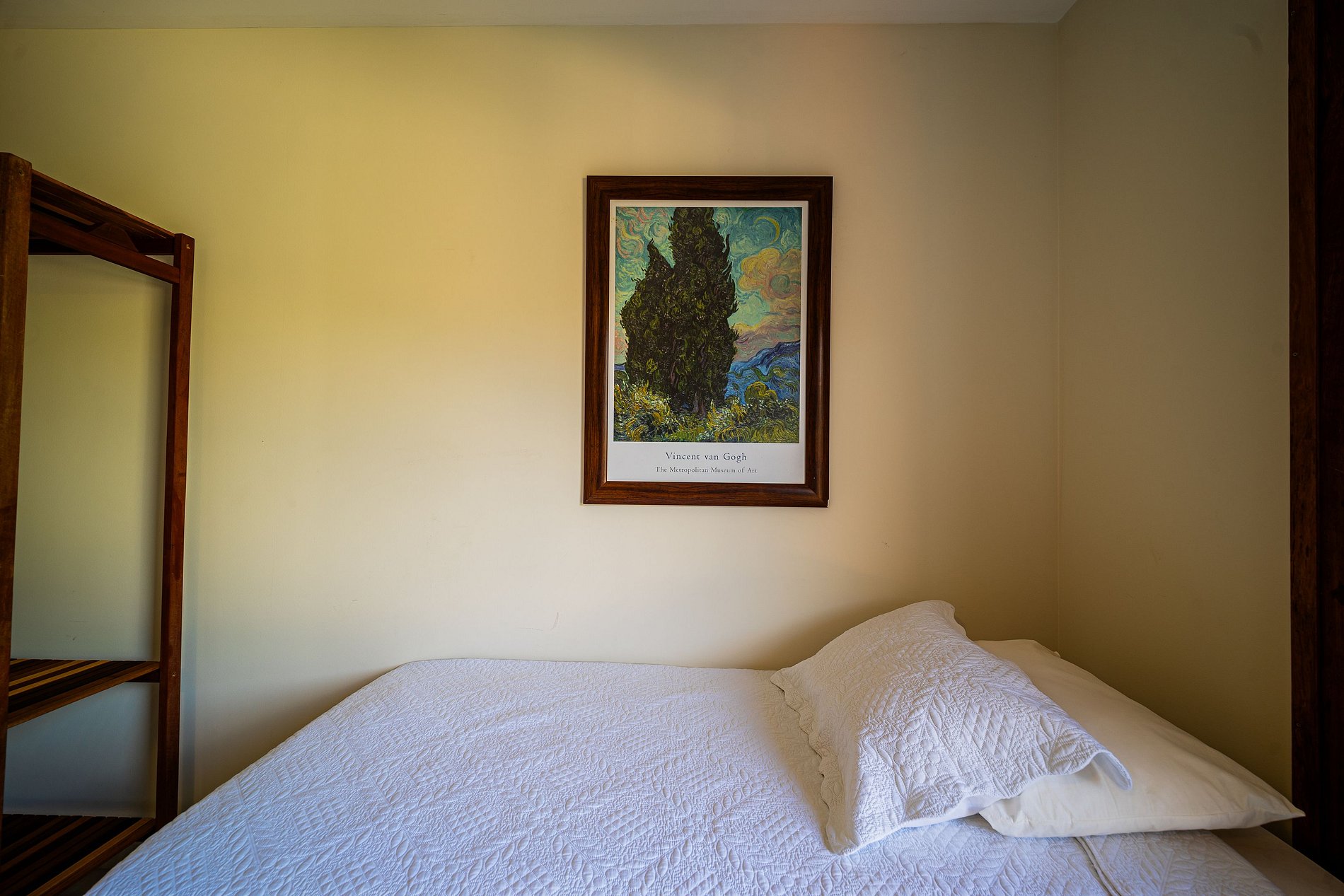 1º Suíte Térrea - Equipado com ar condicionado, ventilador de teto, 1 cama Queen, 1 cama de solteiro e banheiro; (3 pessoas)