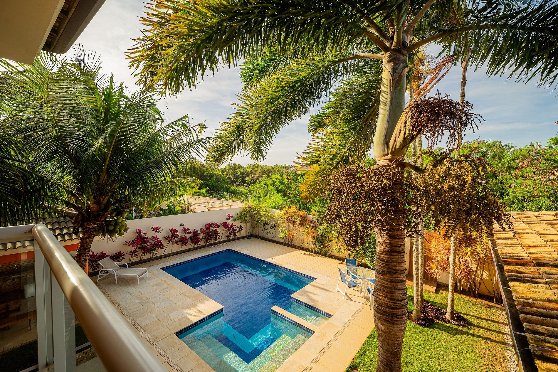 4º Suíte Master Superior - Possui varanda com vista da piscina, Equipada com Ar condicionado, ventilador de teto, 1 cama Queen e 1 bi-cama de solteiro + 1 Berço infantil, banheiro e banheira de hidro; (4 pessoas + 1 bebe ate 2 anos)