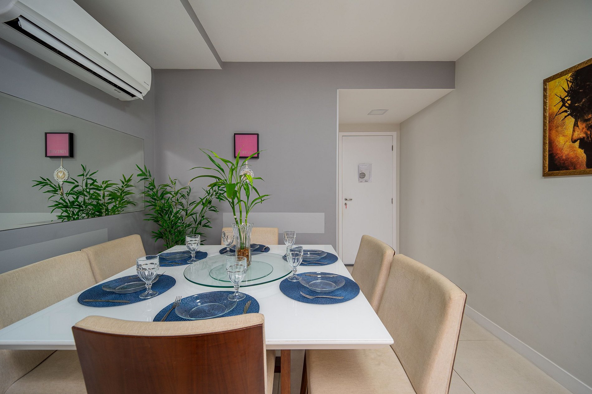Sala de estar com smart TV e jantar com mesa 6 lugares integradas;