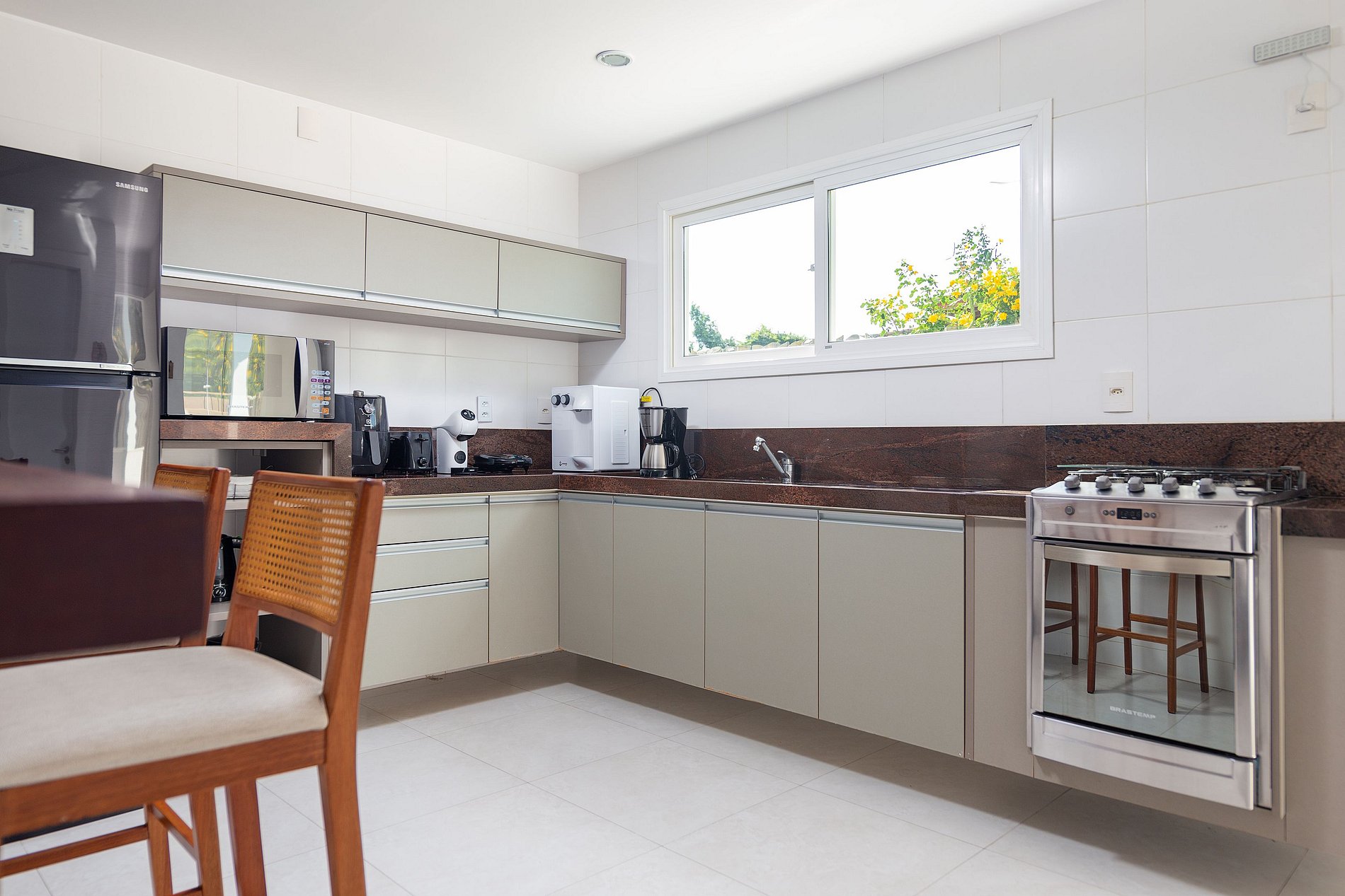 Cozinha completa, com utensílios e eletrodomésticos, fogão, forno, talheres, louças e utensílios e purificador de água para proporcionar funcionalidade.