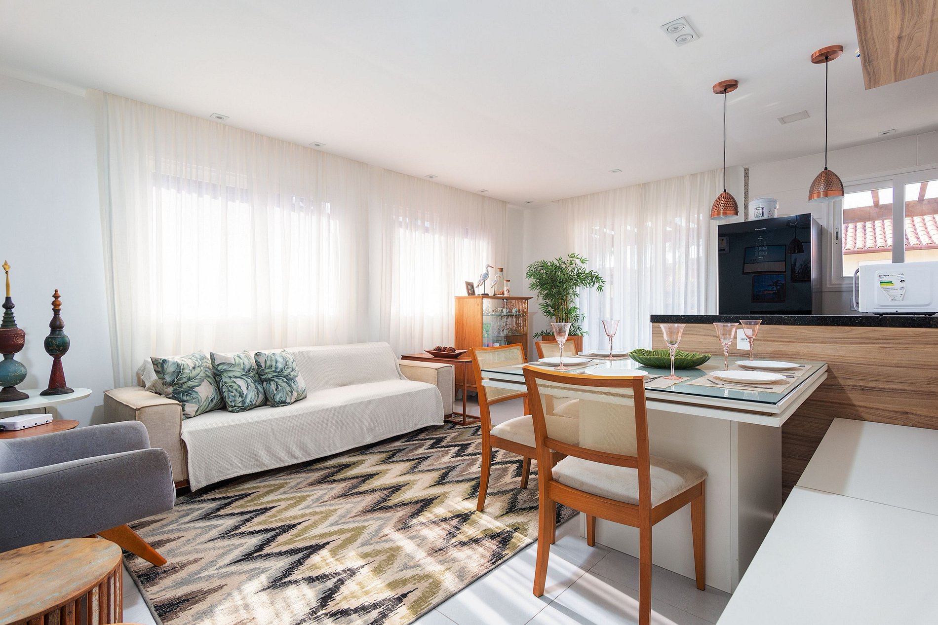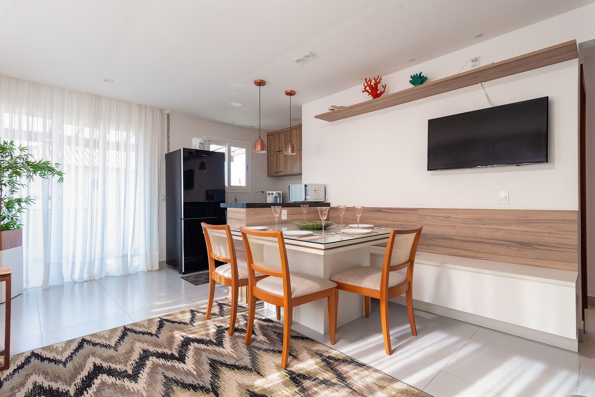 Sofá para 4 pessoas, TV Smart com canais a cabo completos, mesa de jantar para 6 pessoas;