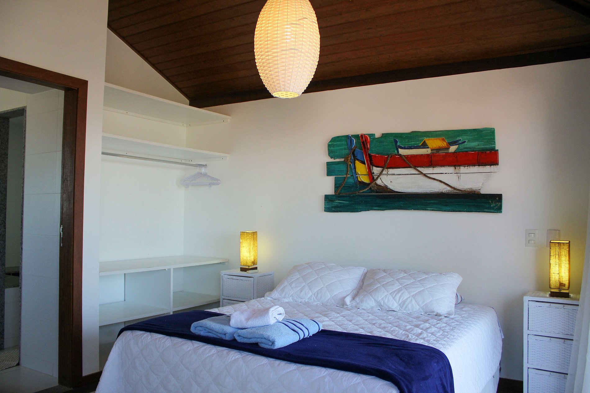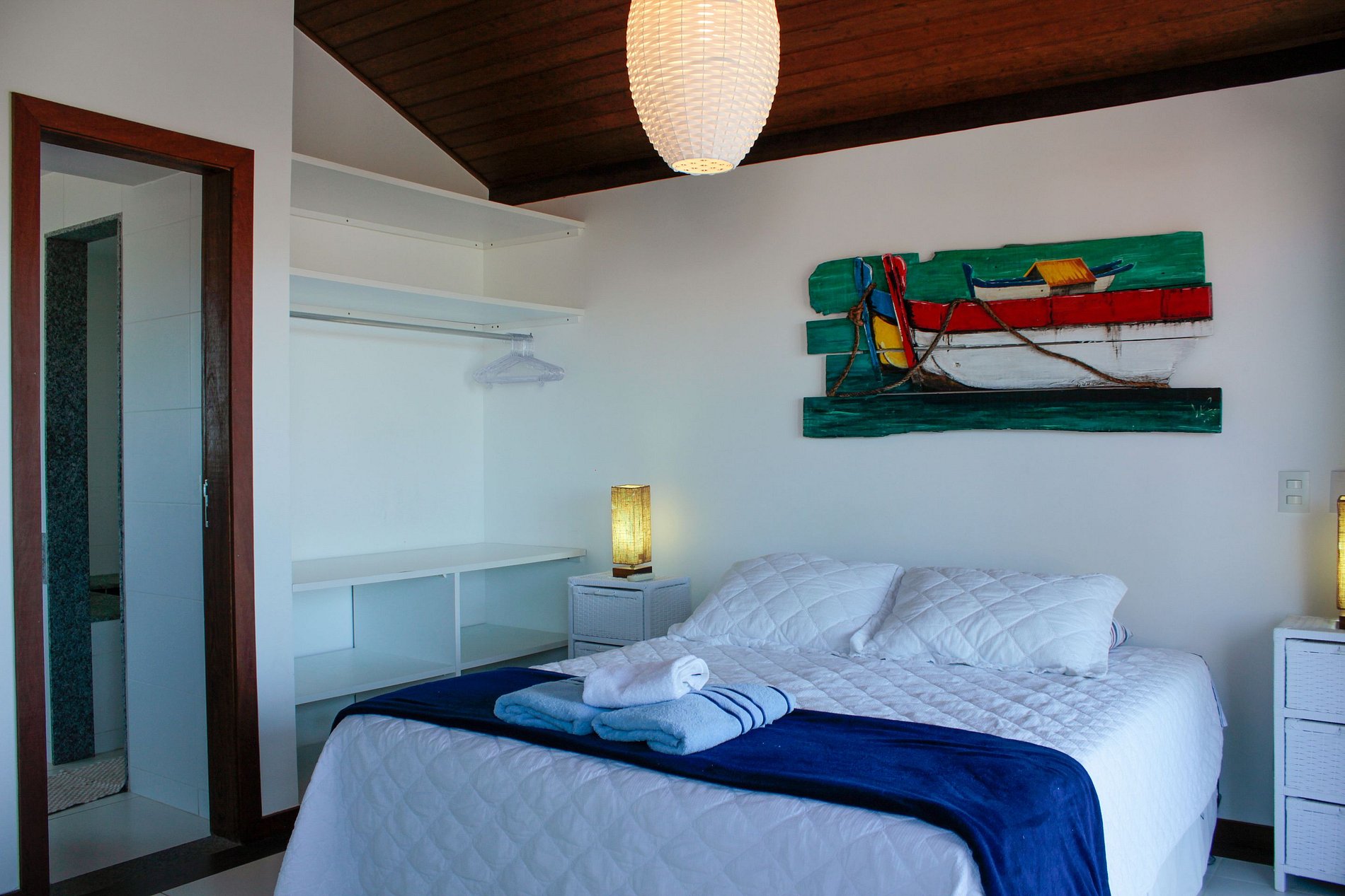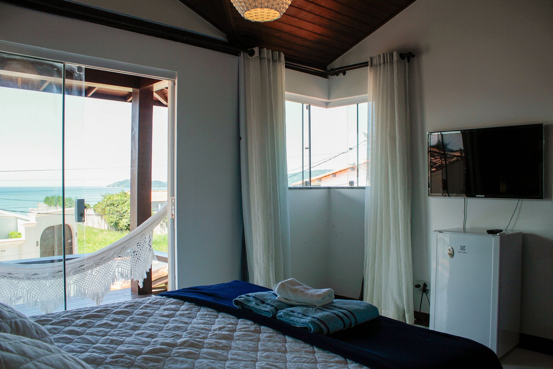 4º Suíte andar superior - Com cama Queen, guarda roupa, sacada com rede e vista pro mar, banheira de hidromassagem, Secador de Cabelo e Tv smart.