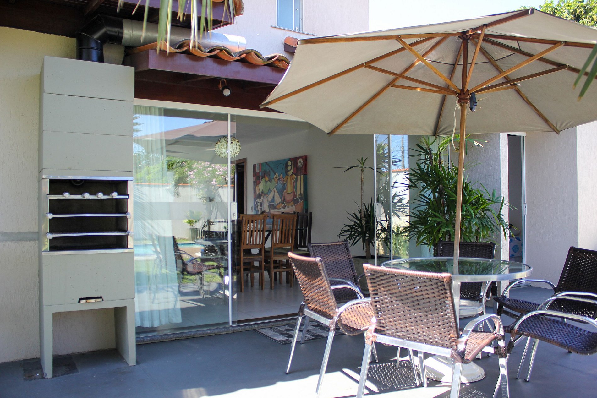 Área Gourmet com churrasqueira, mesa com ombrelone e piscina privativos;