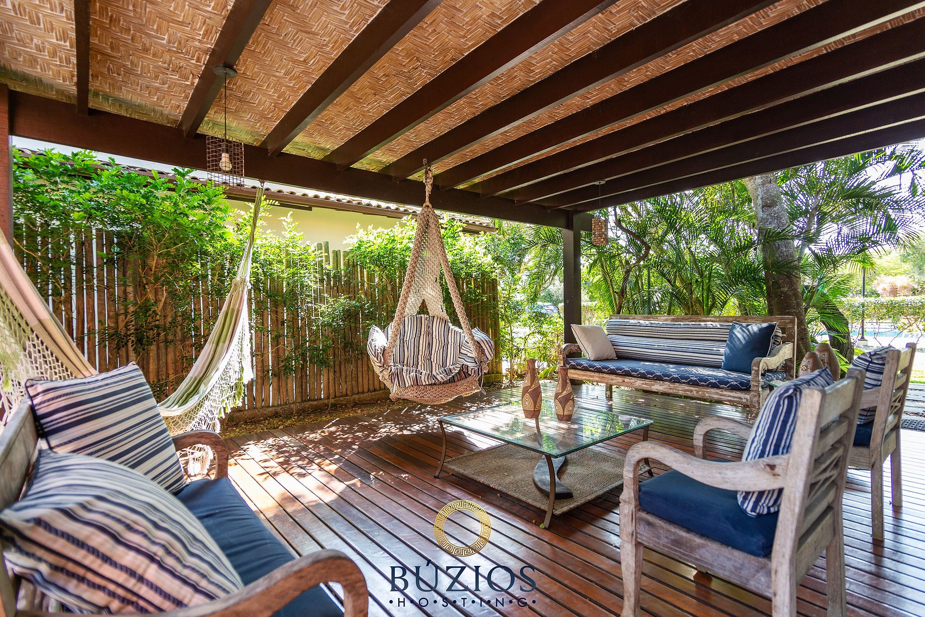 Na entrada lateral temos 1 jogo de sofás, mesa de centro, balanço, rede, piscina privativa com pontos de hidromassagem c/ iluminação noturna e ducha;