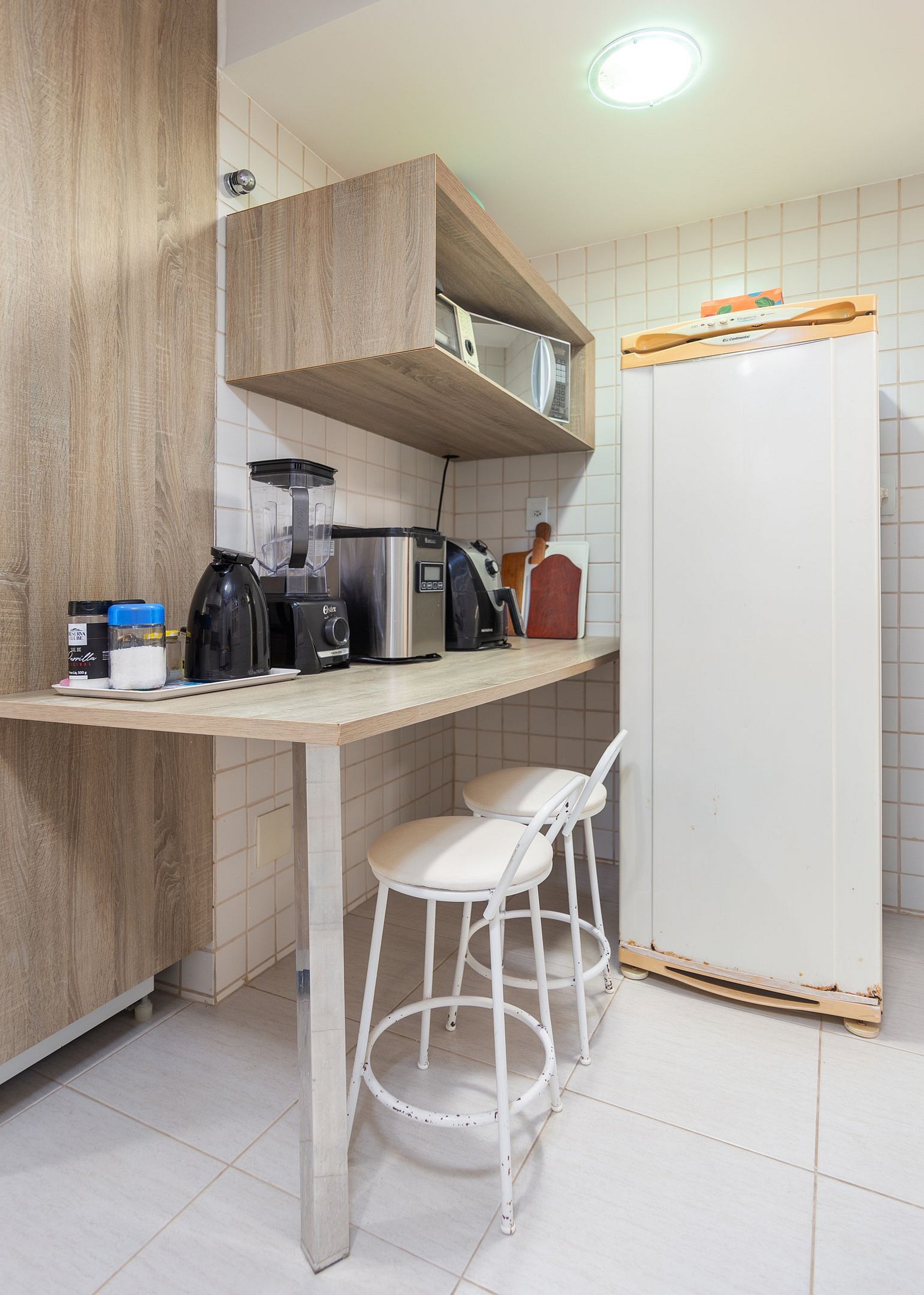 Cozinha completa, com utensílios e eletrodomésticos, fogão, forno, talheres, louças e utensílios e purificador de água para proporcionar funcionalidade;