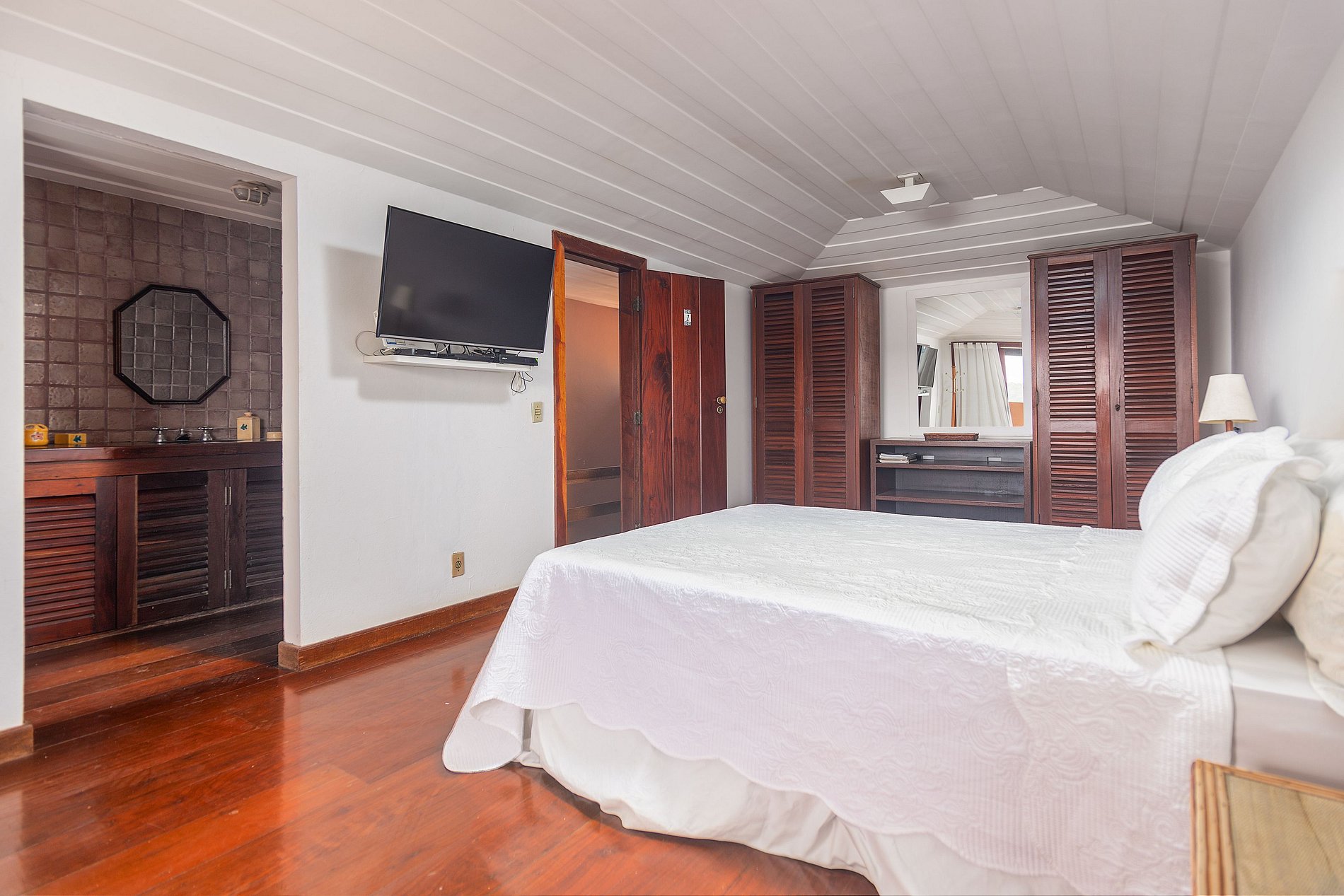 4ª Suíte superior: Cama de casal queen, ar condicionado, tv smart e banheiro (2 pessoas)