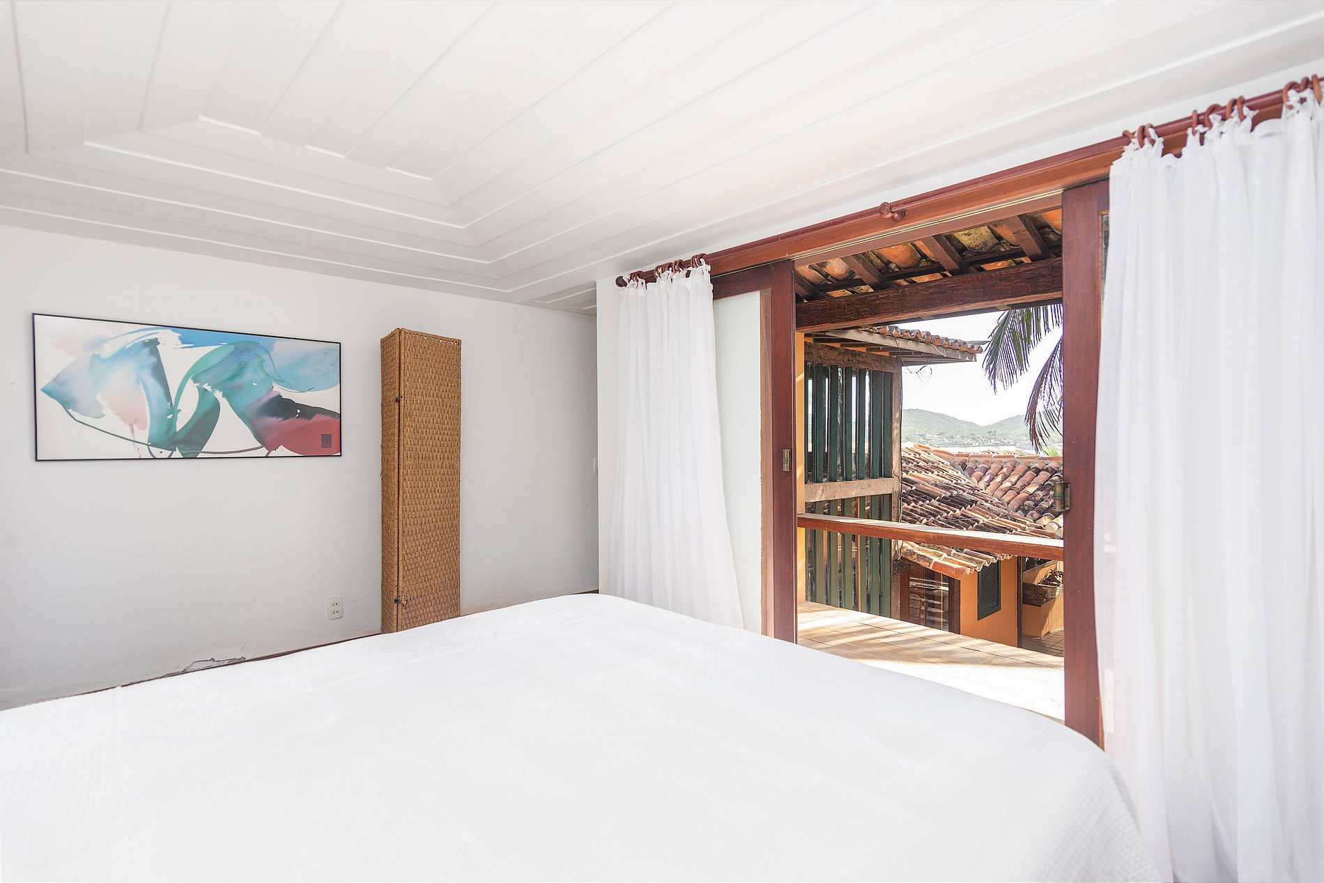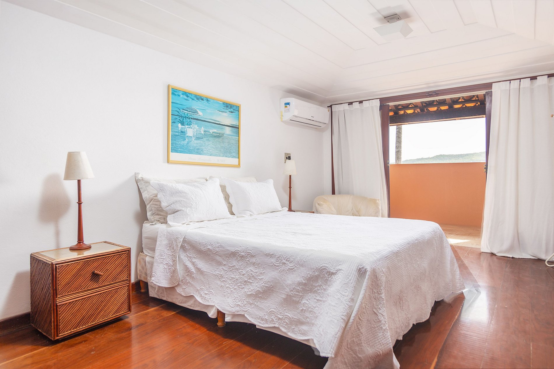 1ª Suíte superior: Cama de casal, ar condicionado, varanda com vista mar e banheiro (2 pessoas)