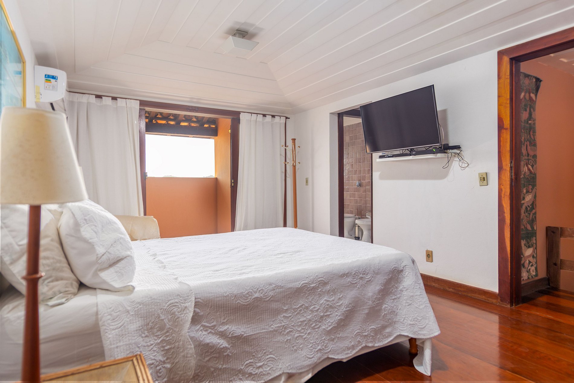 2ª Suíte superior: Cama de casal queen, ar condicionado, tv smart, varanda com vista mar e banheiro (2 pessoas)
