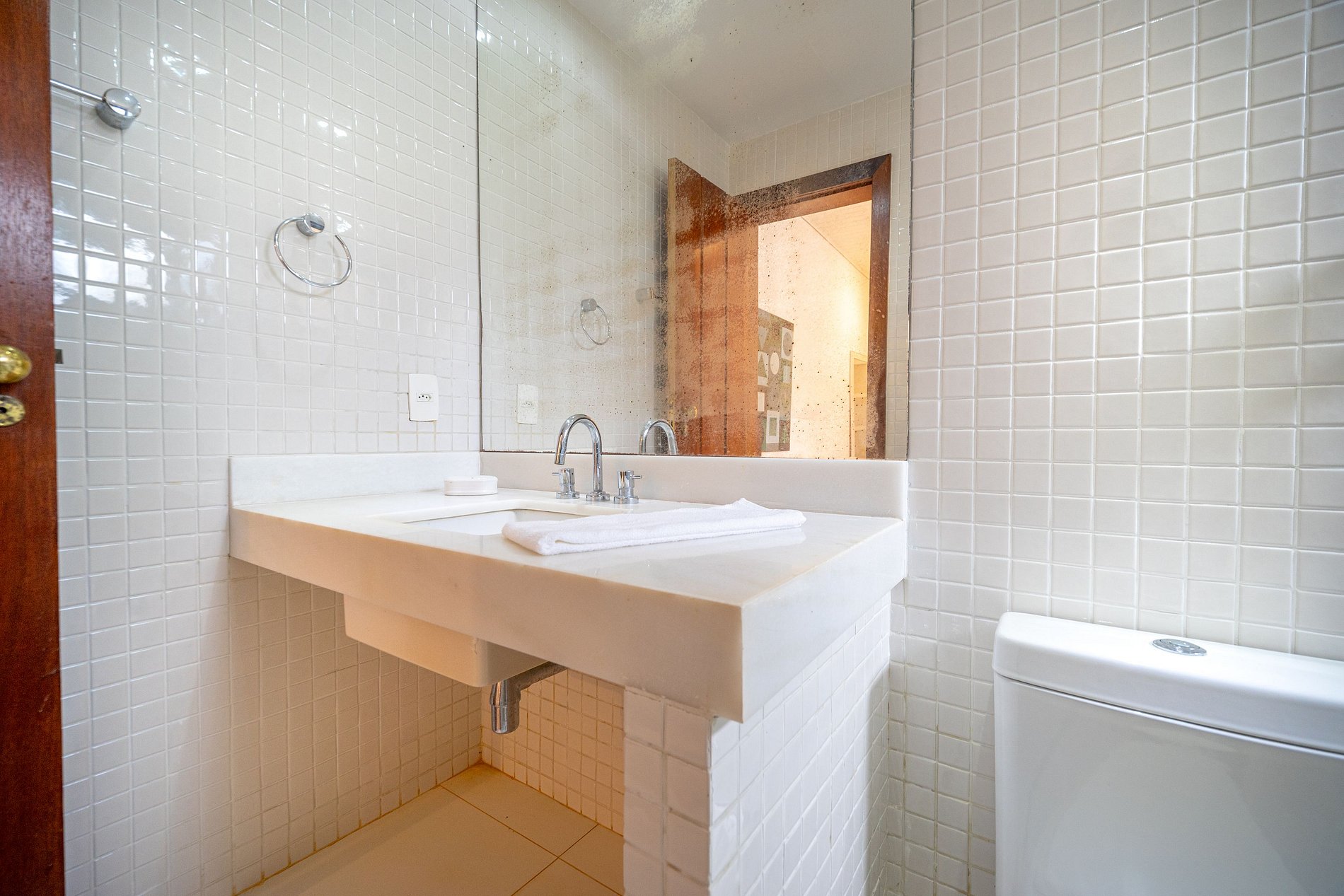 A entrada ocorre mediante identificação dos hóspedes e entrega de chaves através de check in presencial;