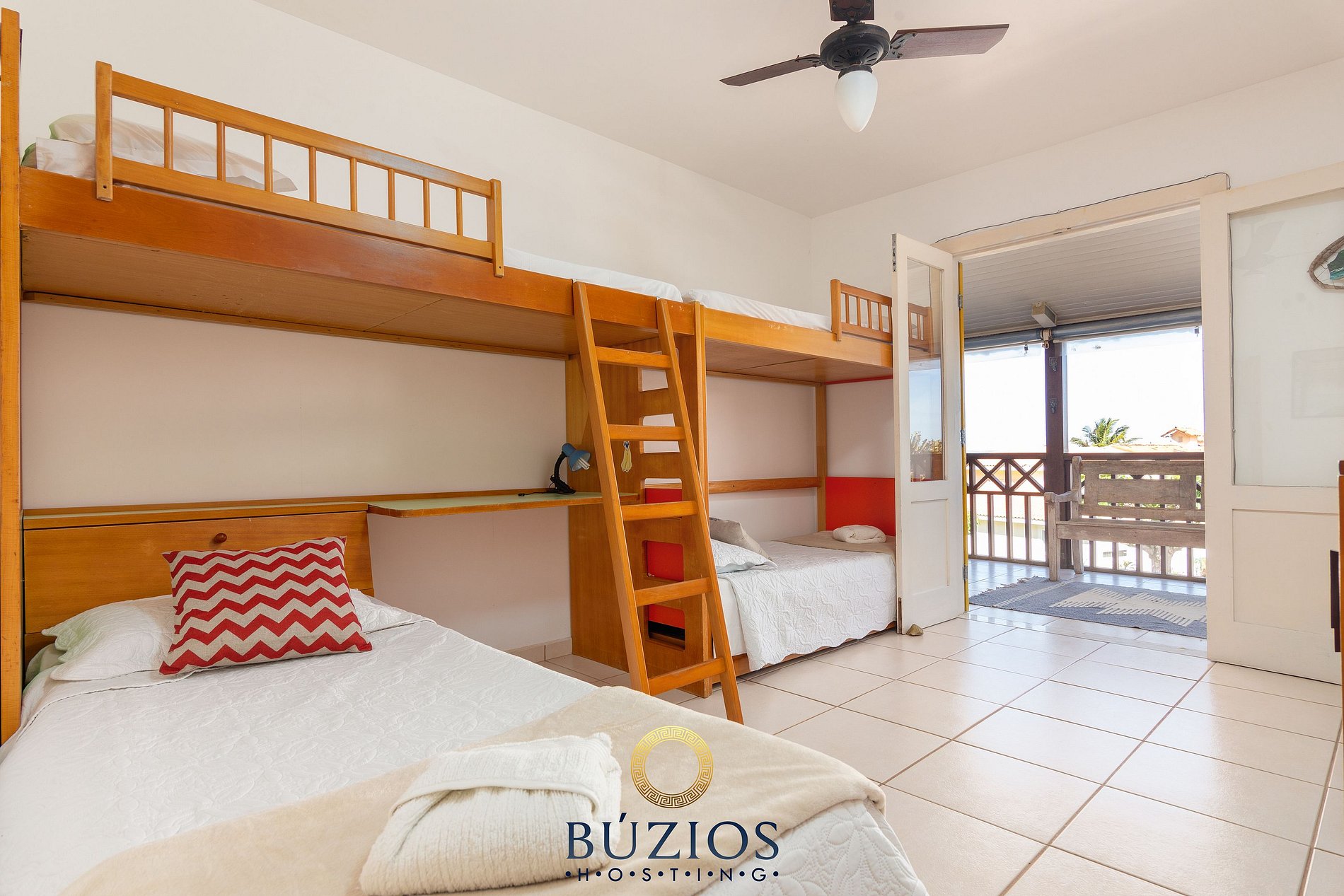 1 suíte com 4 camas de solteiro, ventilador e varanda;