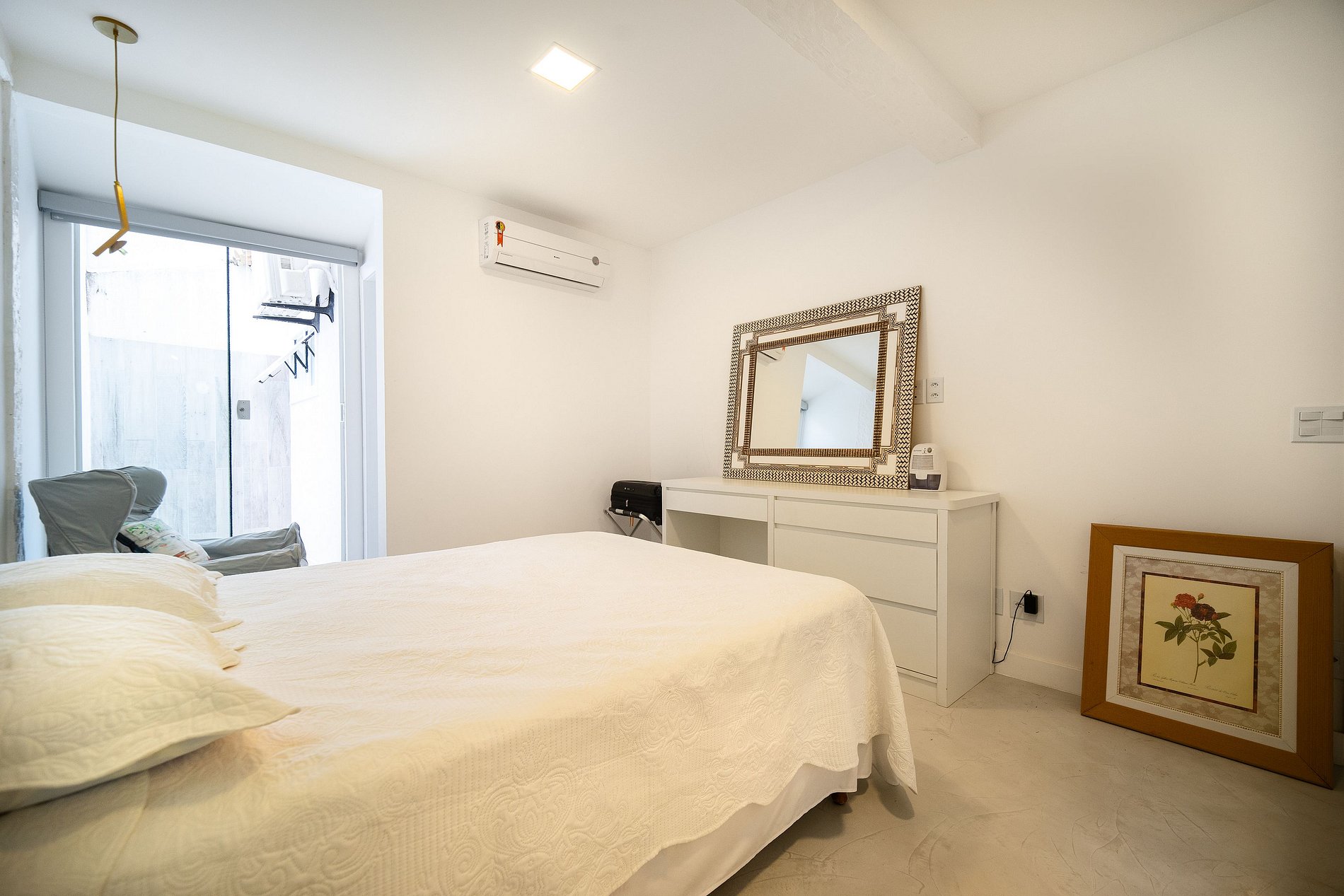 1º Suíte : Cama de casal, ar condicionado, guarda roupa, smart tv e banheiro (2 pessoas);