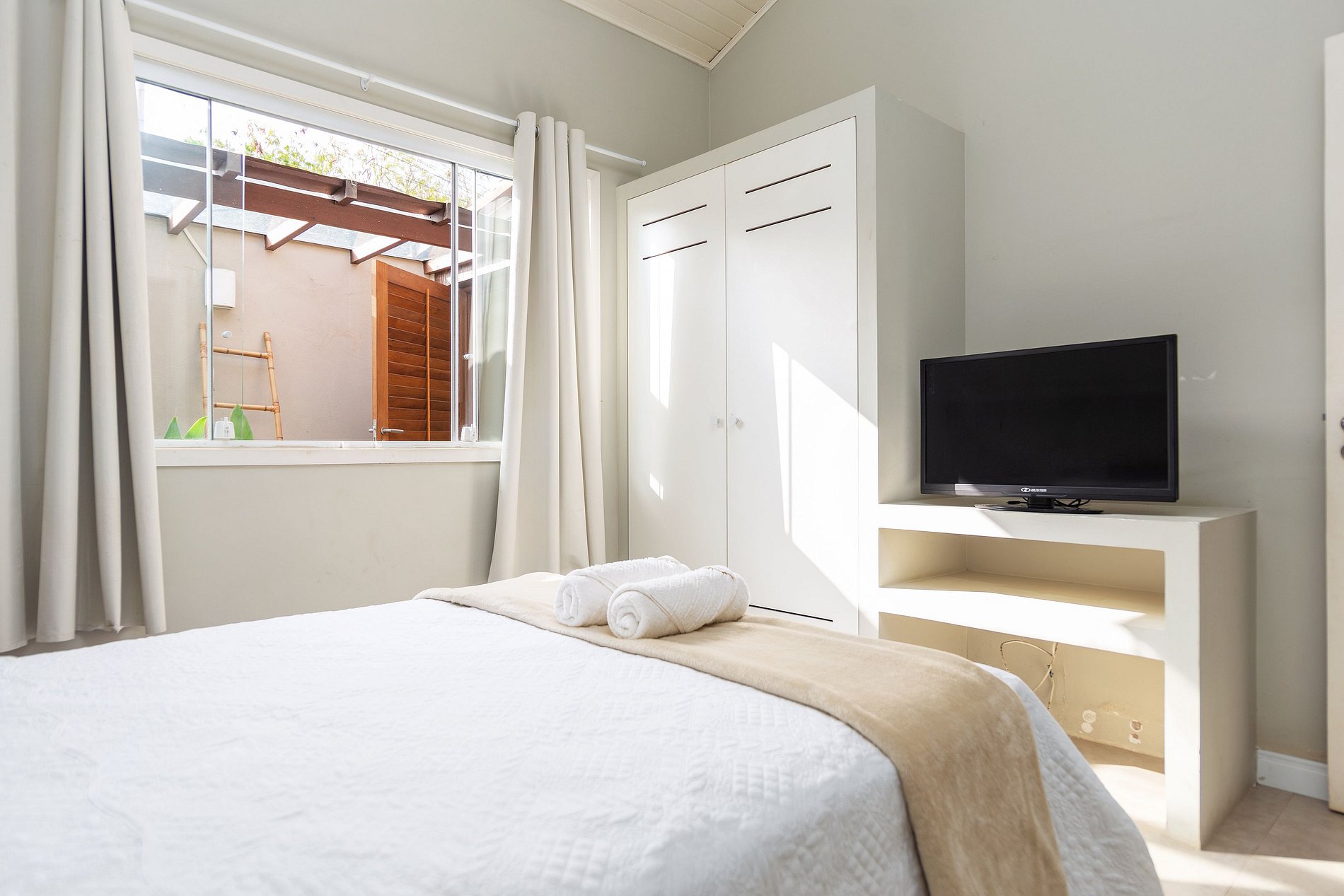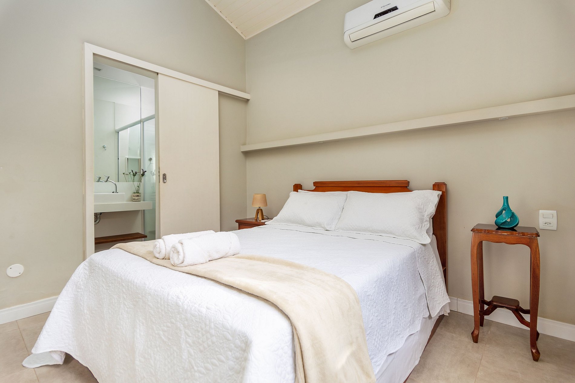 1 suíte máster com 1 cama Queen e vista para área de piscina;