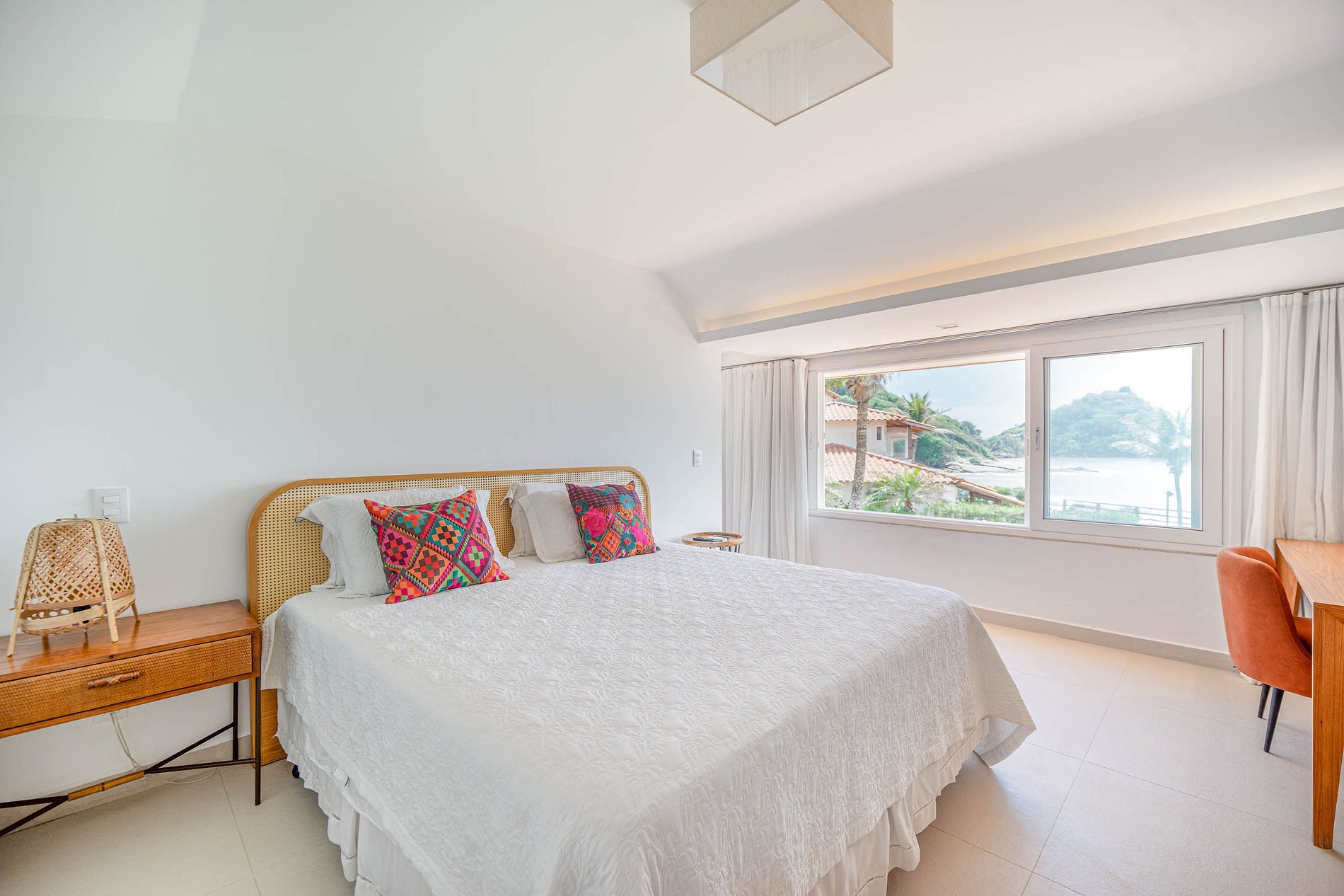 A casa conta com 4 suítes confortáveis (algumas com vista para o mar), acomodando até 12 hóspedes;