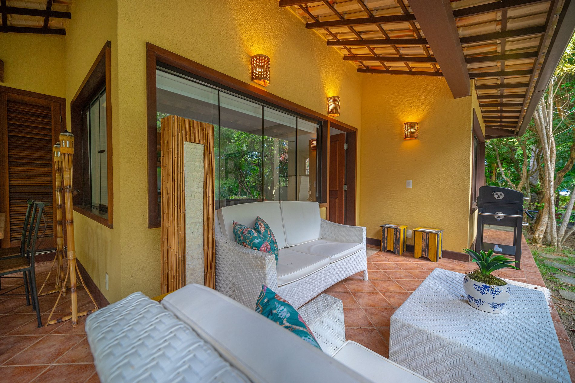 Área de lazer com churrasqueira privativa móvel e sofás;