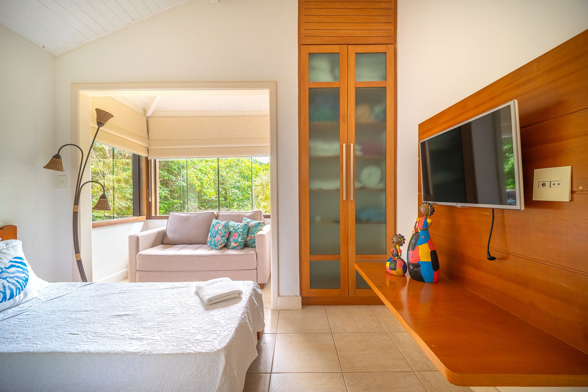 A casa possui 4 suítes climatizadas que acomodam até 10 pessoas: