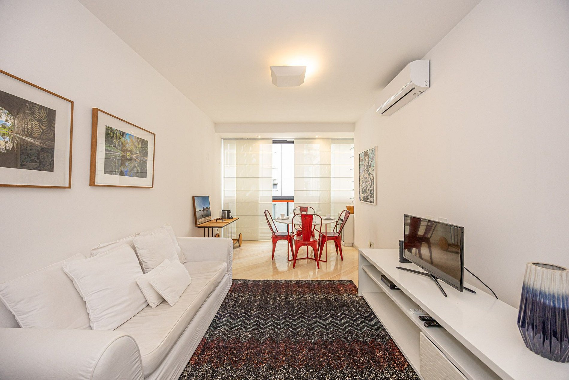 Sala de estar com sofá e TV integrada com sala de jantar com uma mesa de 4 lugares;