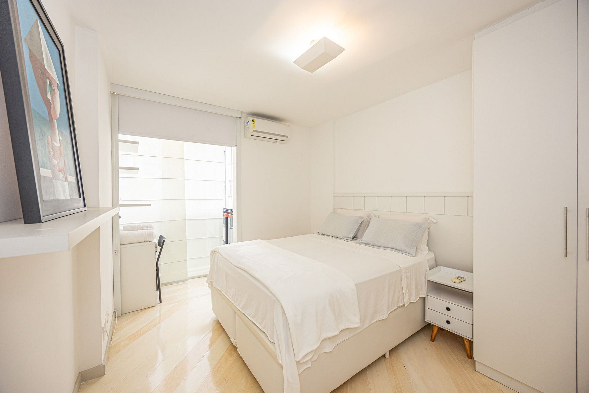 1º Quarto: Cama de casal, ar condicionado, guarda roupa e espaço para home office (2 pessoas);